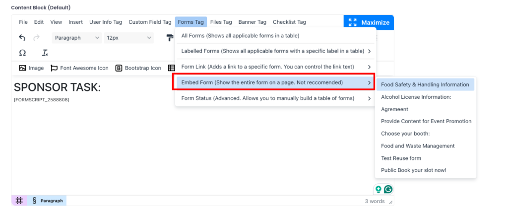– From the Forms Tag Dropdown, select “Labelled Forms”, and select the label you assigned (e.g., COMPULSORY). The tag [FORM_COMPULSORY] will appear in the editor box.