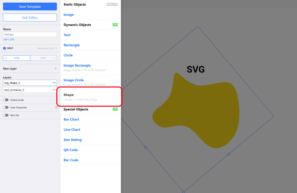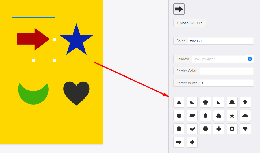 It’s possible to upload SVG files as shapes. You can add borders, shadows, and change the fill colour in the editor itself.