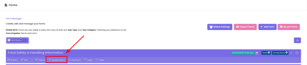 To begin, navigate to your Form Manager and click the Notifications icon.
