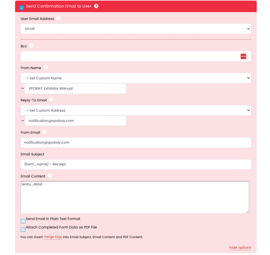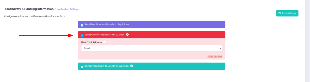Next, enable the Send Confirmation Email to the User option by ticking the checkbox. For example, to receive notifications in your inbox, check the option labeled Send Notification Emails to My Inbox.