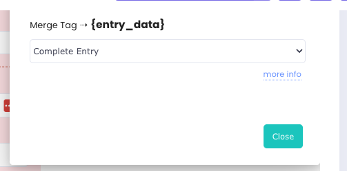 Merge tags are special identifiers that are automatically replaced with the data entered by a user in the form. To use merge tags, simply click on the Merge Tags option to view a list of available fields from your form. Copy the tag name (including curly braces, e.g., {USER_NAME} or {entry_data}) and paste it into the email content, subject, or any other field that supports it.