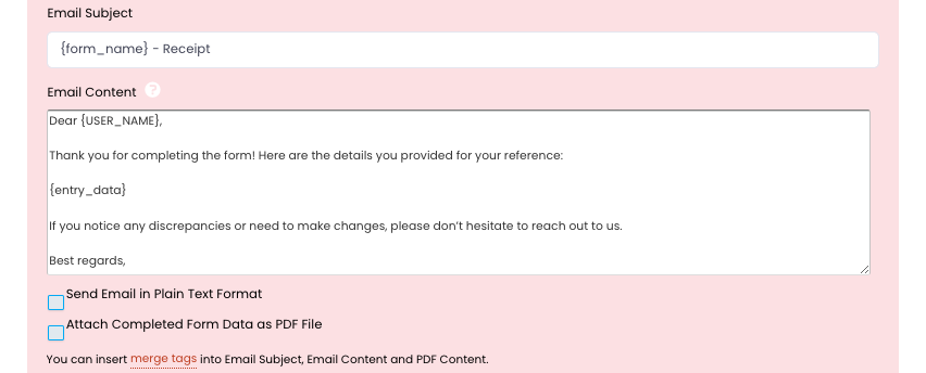 While customising these fields, you can also use Merge Tags to dynamically insert user-submitted data into your email notifications.