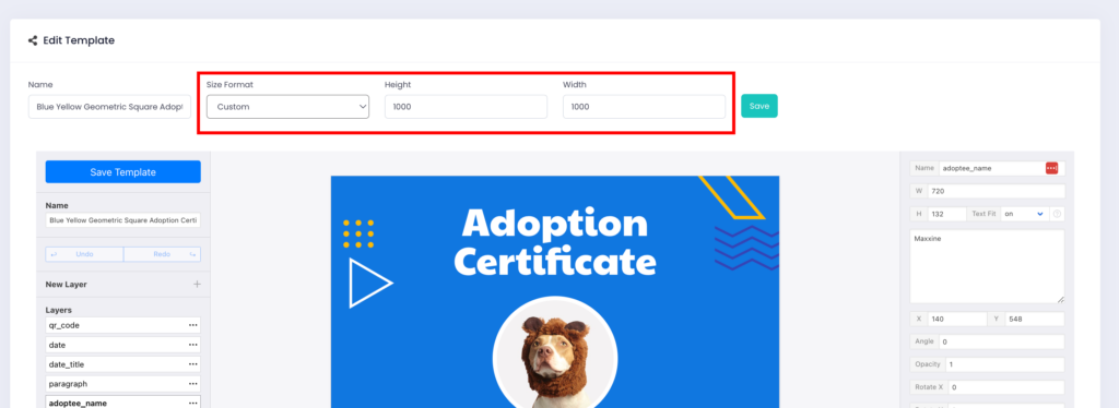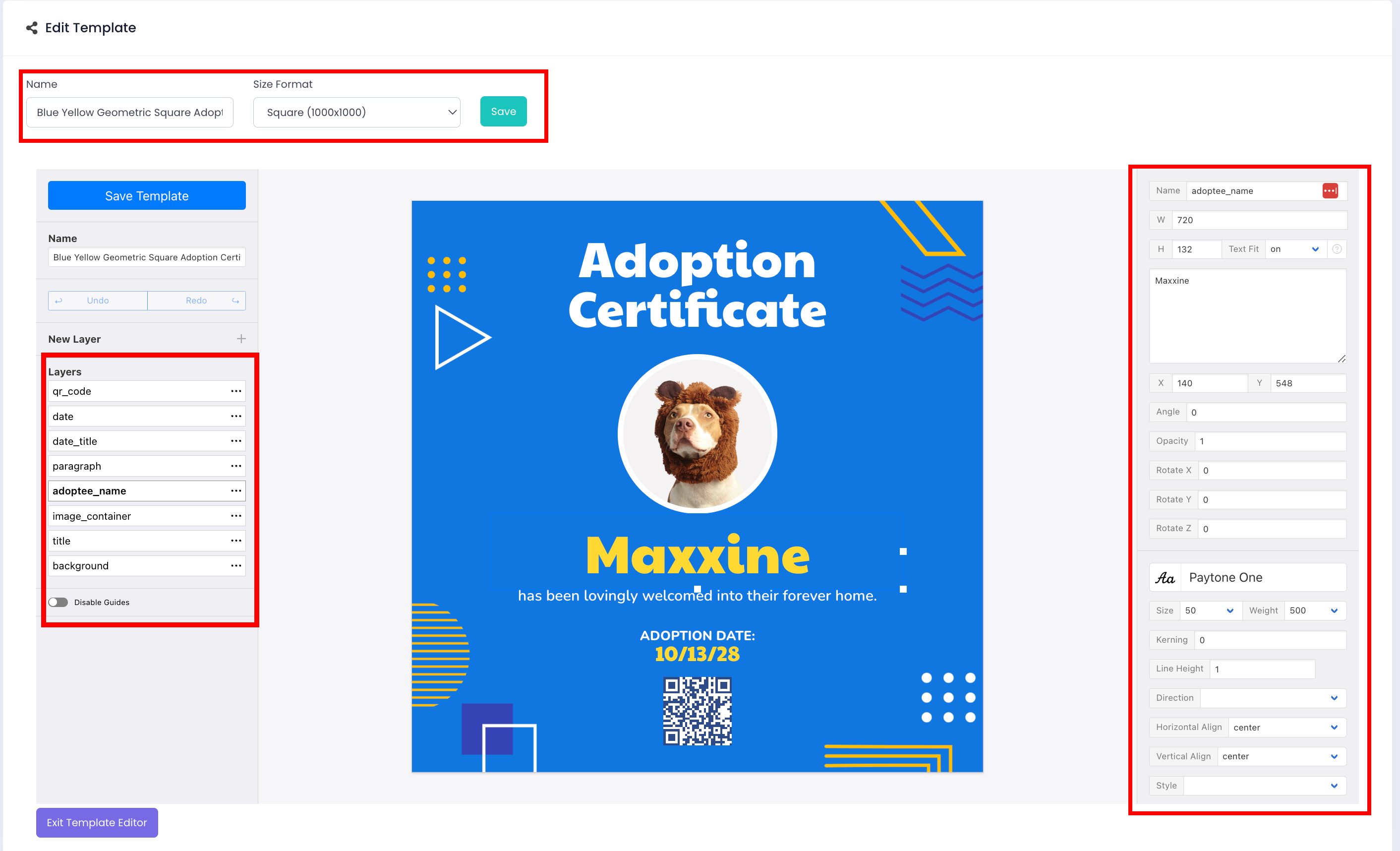 The Template Editor offers a layer-based system (similar to Adobe Photoshop), allowing for detailed adjustments, such as adding or modifying text, images, or design elements.