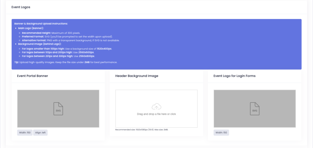 • Event Logo: A primary logo that represents your event across pages.