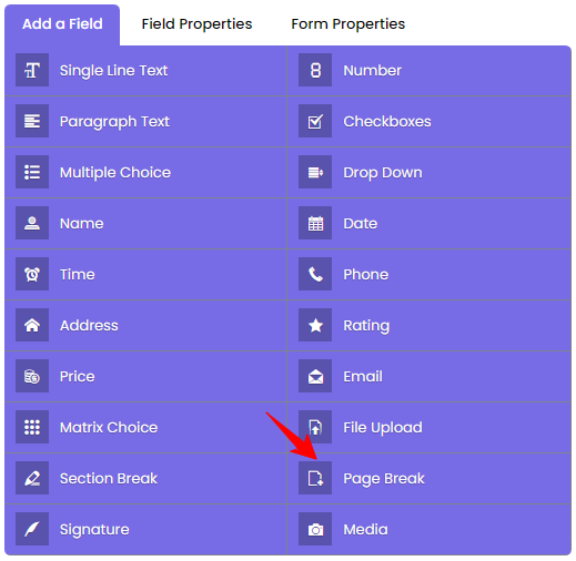 To be able using the skip-page logic, your form needs to have at least two pages. If your form already consists of multiple pages, you can skip this step. Otherwise, add a Page Break field at the end of your form.