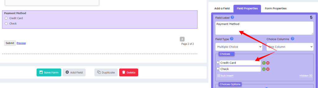 Add a Multiple Choice field into your newly created page (or if you already have multiple pages, add it to the last page). Change the multiple choice label and choices to this: