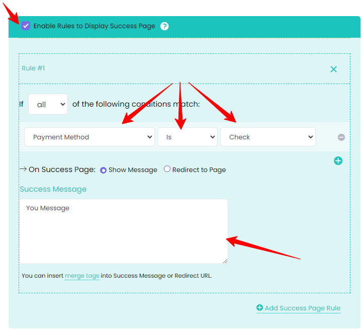 Go to your Logic page again and select Enable Rules to Display Success Page. Adjust the rule to be like this: