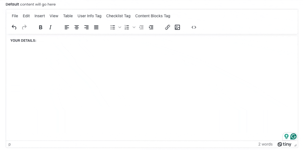 Once you select an option, the corresponding Roadshow tag will automatically appear in the editor. This makes it easy to add dynamic tags to your content without having to memorise their formats.