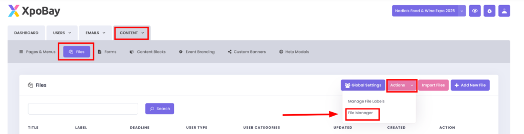 • Upload files tailored for individual users (e.g., 0041.pdf for one exhibitor, sponsor_gold.pdf for another).