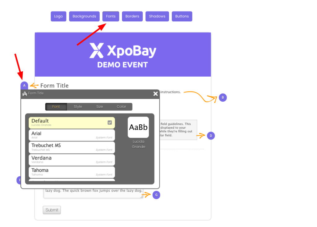 2. You’ll notice several circular alphabetical buttons, each representing different text elements (e.g., form title, field labels, guidelines, input text).