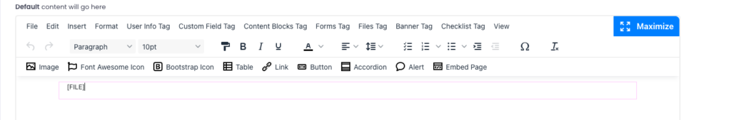 • Display All Files: Simply add the [FILE] tag to your page. This will display all uploaded files on the page.