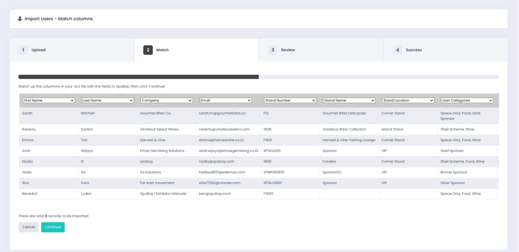 – After uploading, the system will automatically map the columns (e.g., First Name, Last Name, Company) to the appropriate fields in the system.