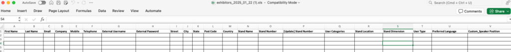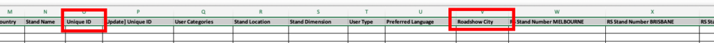 When downloading a .xls import template for a Roadshow City event, instead of seeing Stand Number, you will see Unique ID as the primary identifier.