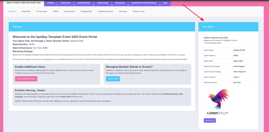 The Sidebar allows you to display customised and dynamic information for exhibitors, sponsors, or other users. It can be added to any event page and appears on the right-hand side to showcase user-specific details while keeping your event pages consistent and organised.