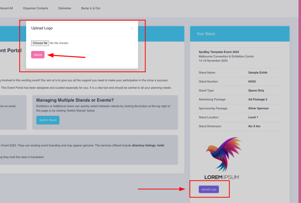 You can use the Sidebar to request exhibitors or sponsors to upload logos. Logos sync automatically with banners, profiles, and other materials.