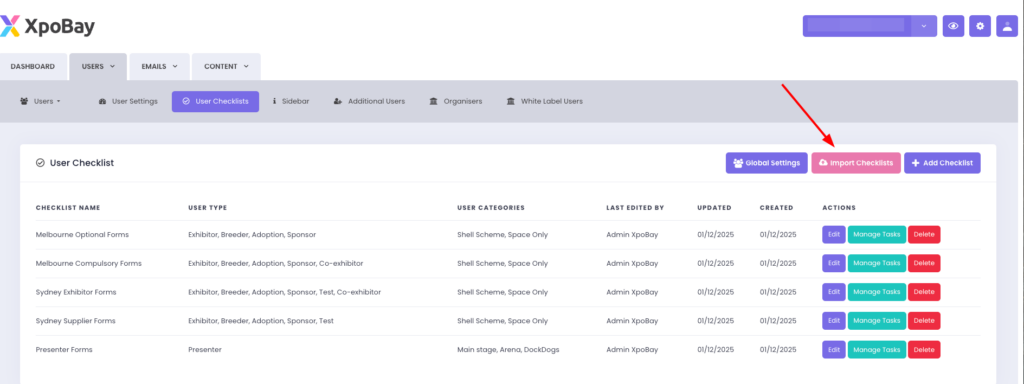 User checklists revolutionise event task management, giving organisers full control and visibility over tasks assigned to users such as exhibitors, speakers, and sponsors. Whether tasks are on the XpoBay platform or off-platform, organisers can ensure they are tracked and completed efficiently.