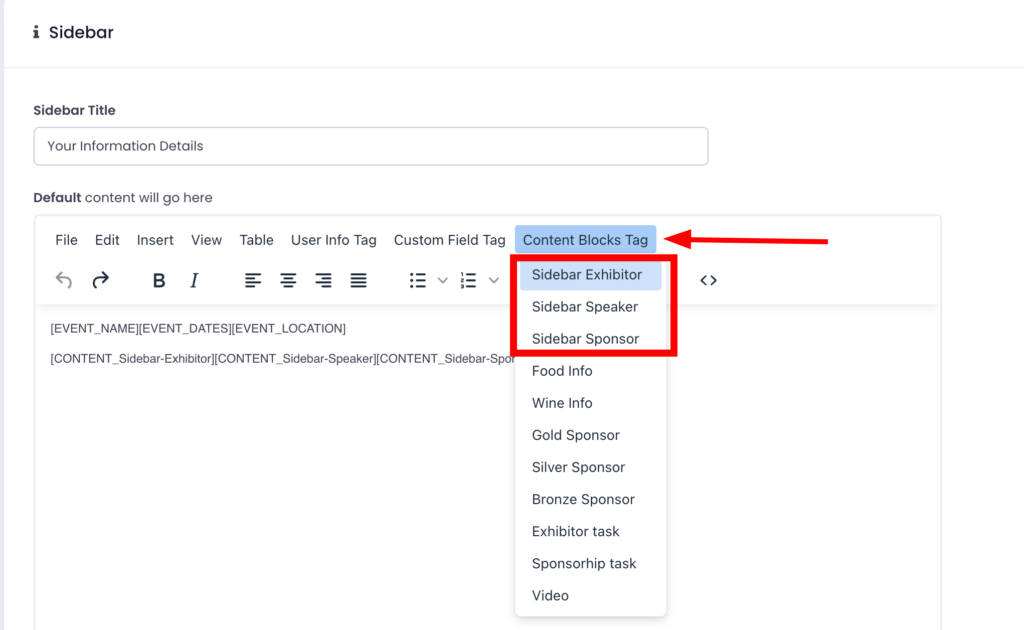 Using content blocks in the Sidebar allows you to display personalised information for different users, such as exhibitors, speakers, or sponsors. Follow these steps to set it up: