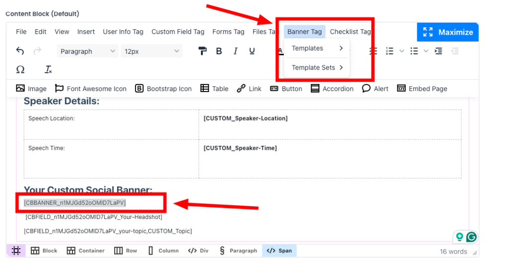 Navigate to the Content Blocks section. Create a new content block or edit an existing one, and insert your custom banner tag.