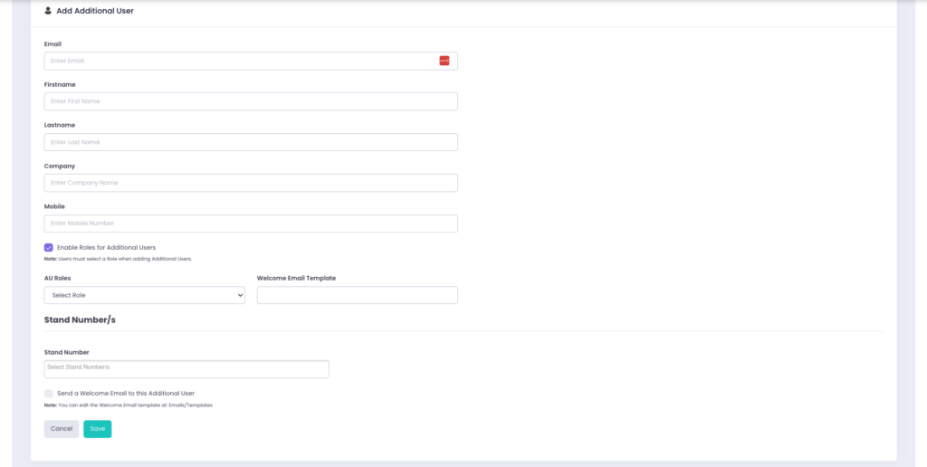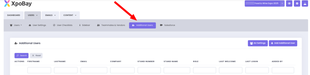 Additional users (AUs) are secondary accounts linked to a primary (parent) user, such as an exhibitor. These AUs enable the parent user to delegate tasks, share responsibilities, and streamline event management without granting full access to their content.