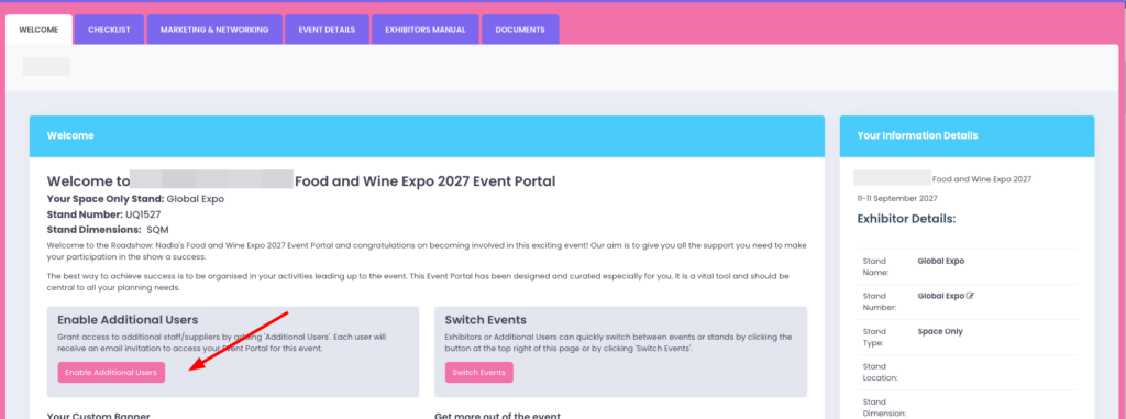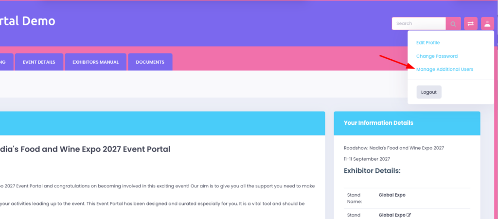 To make this easier to access, organisers can also add a button or link on the home page that directs exhibitors to the Manage Additional Users page.